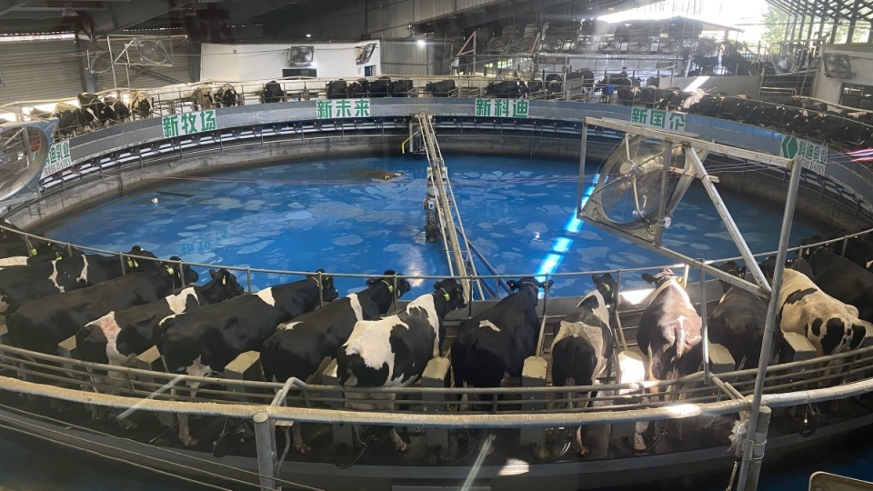大河报·豫视频记者现场看到,一个巨大的圆盘边,排成长队的牛群没有任何混乱和恐惧,像知道自己应该做什么一样,一头紧跟着一头主动站上挤奶台,挤奶设备会自动与奶牛对接,神奇的自动挤奶就开始了,旁边仅有两三名工人在调整设备。结束后,奶牛们会安静有序地主动走下转盘,回到牛舍。